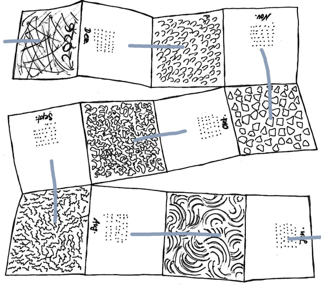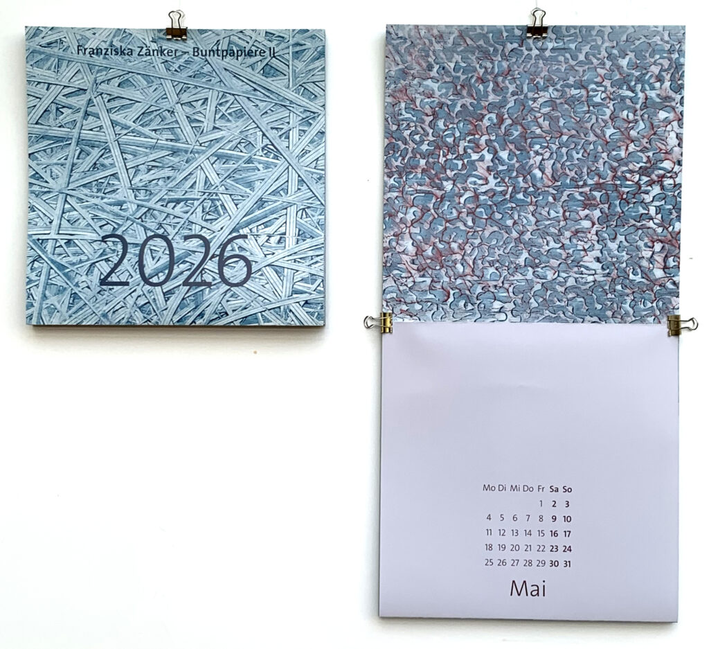 Kalender 2026 • Zartheit • Buntpapiere II • Wie schon vor zwei Jahren funktioniert der Kalender in sogenannter Schlangenfaltung aus einem (!) A0 Bogen, beidseitig bedruckt, der mit drei Klammern gehalten wird. Maße 28 x 28 cm, aufgeklappt 28 x 56 cm. Den Kalender kann man telefonisch unter 0173 6060799 oder per Mail (franziskazaenker@posteo.de) zum Preis von 15 € bestellen. Er kann im Atelier abgeholt oder gegen Vorauskasse & zuzüglich 6,50 € Porto versandt werden. Auflage 100 Stück.